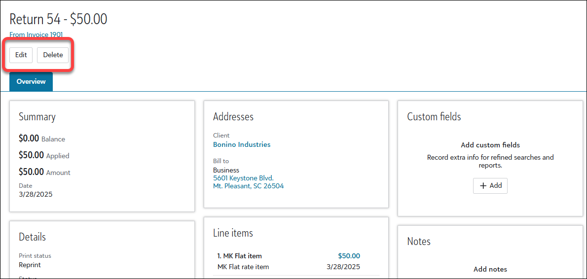 To add a return for a client, you can now reverse an invoice. From an invoice record with unposted line items, select Reverse.