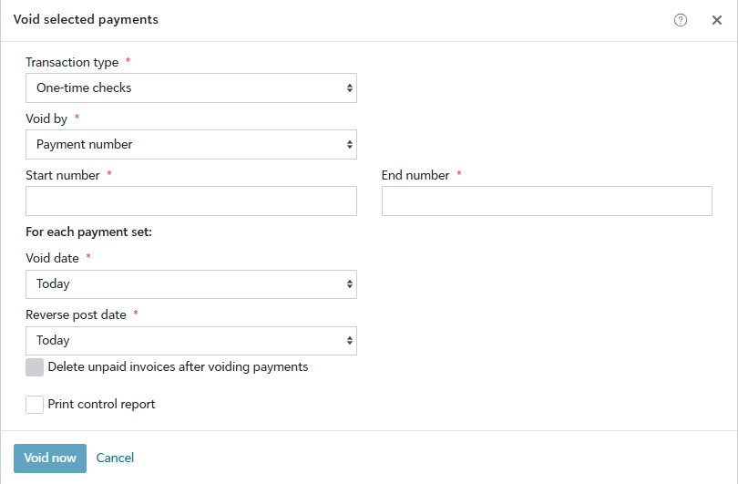 Note: One-time checks can also be voided directly from the check record, consistent with other payment workflows.