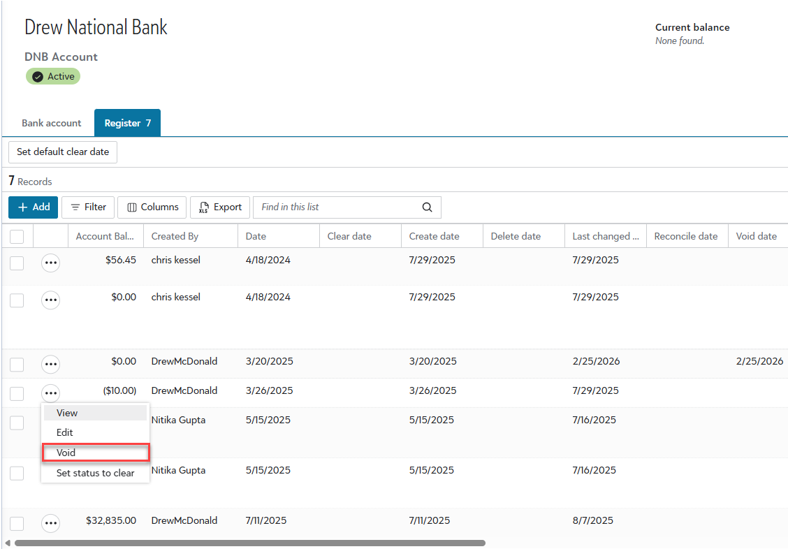 From the Register tab of the bank account, you can void a transaction that does not already have a Voided status. Open the transaction’s menu, enter the required criteria, select Void now and then confirm.
