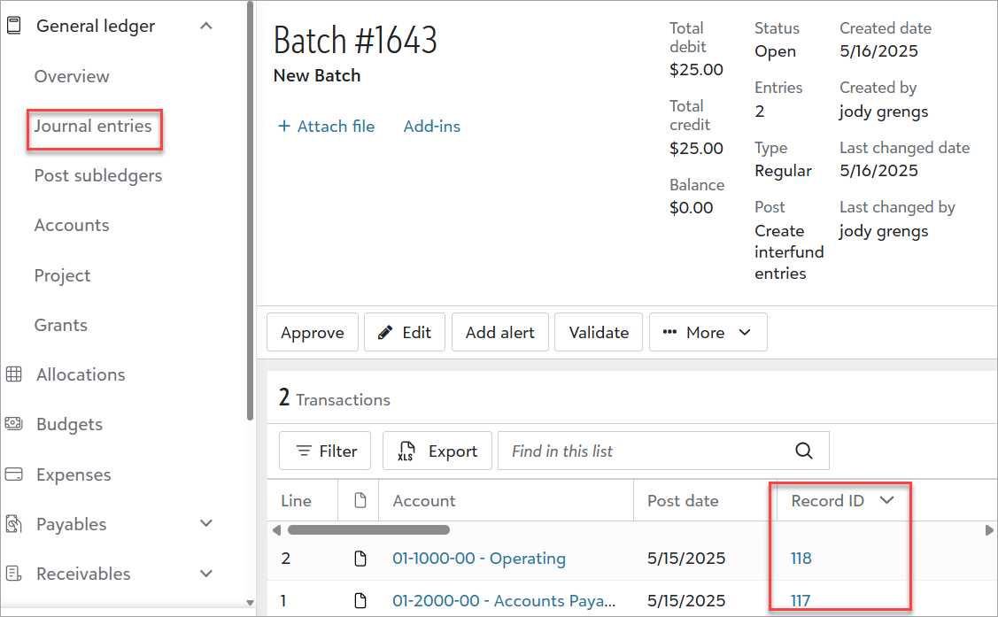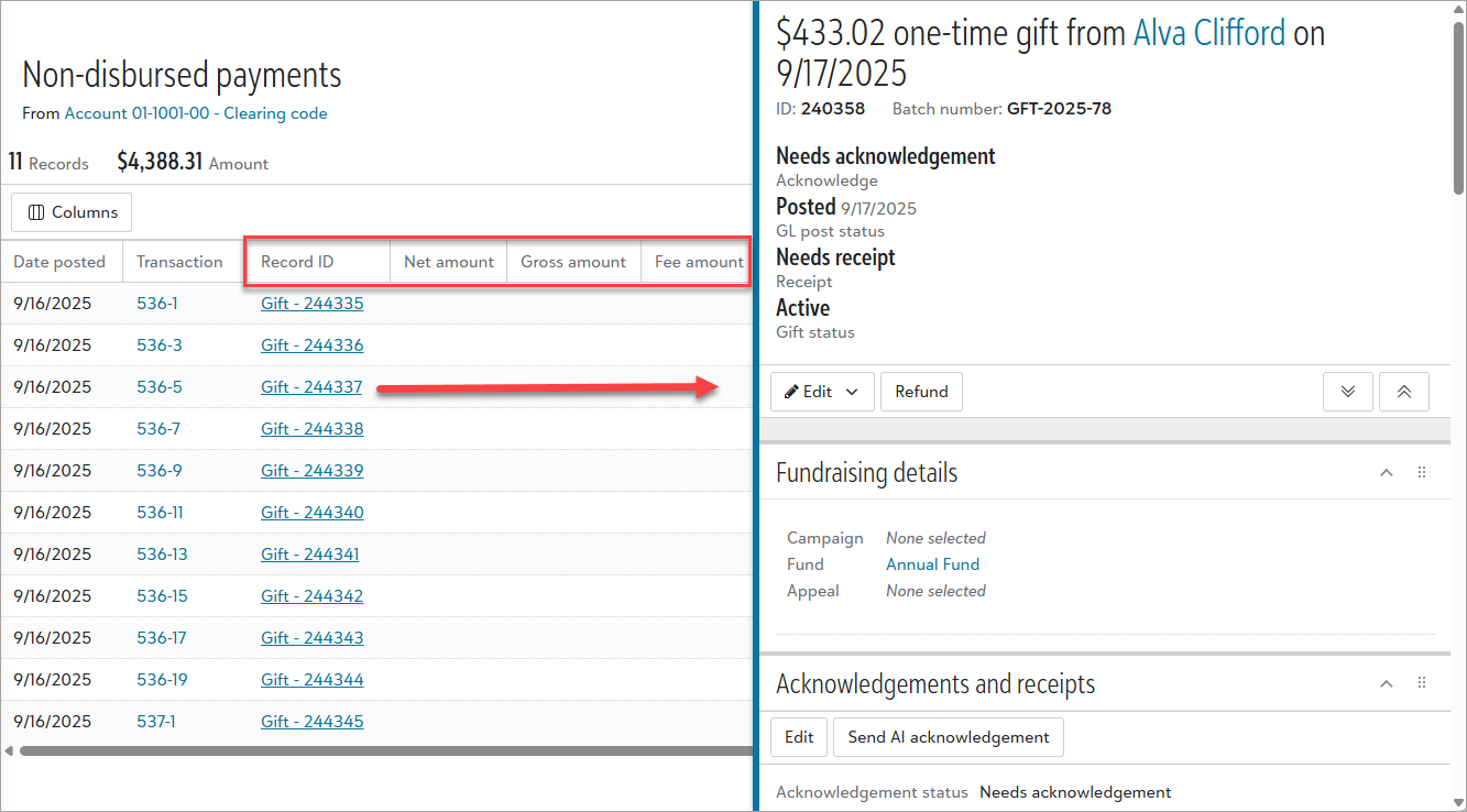Select a payment's Record ID to drill in and view gift details directly in Financial Edge NXT (you can view from the batch as well!).