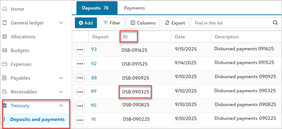 Tip: The ID for automated deposits will be similar to "DSB - deposit creation date".