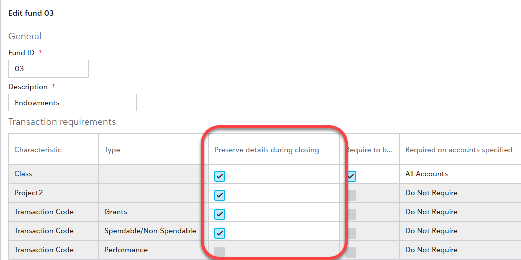 Be aware that data for the unselected characteristics isn't carried forward when you close the fiscal year. For more details about editing funds, see Funds.
