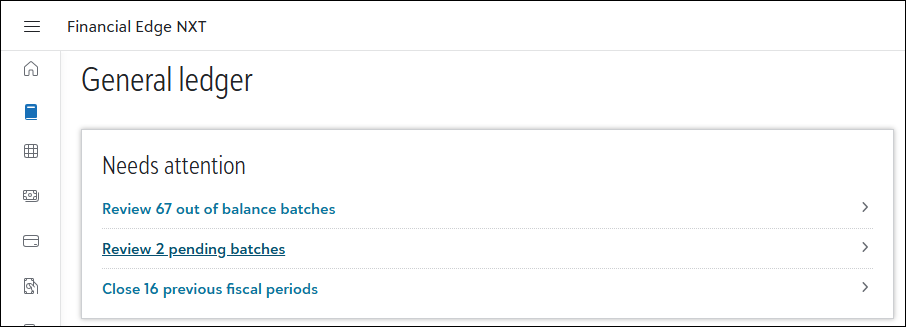 Under Needs attention, resolve the tasks that need immediate action. For example, post transactions in out-of-balance batches and review and process pending batches to begin your workflow.