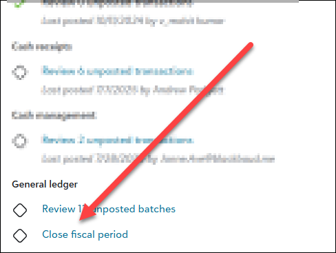 After posting all transactions and batches, use Closing assistant to close periods. Under General ledger, select Close fiscal period.