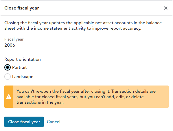 When the list of open fiscal years displays, select Close and you're then prompted to close the oldest open fiscal year. After selecting the report format (Portrait or Landscape), select Close fiscal year to finalize the closing.