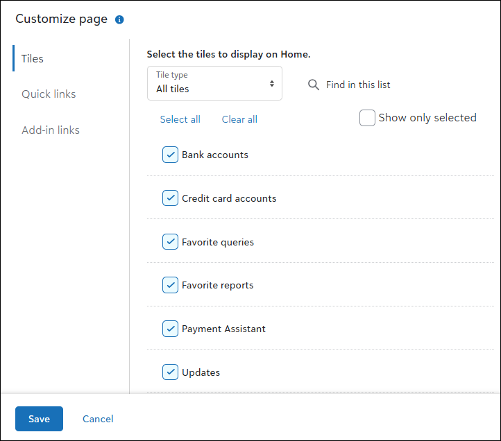 To get started, navigate to Home and select Customize page. From there, review the available options from Tiles and select the ones to display on your Home page.
