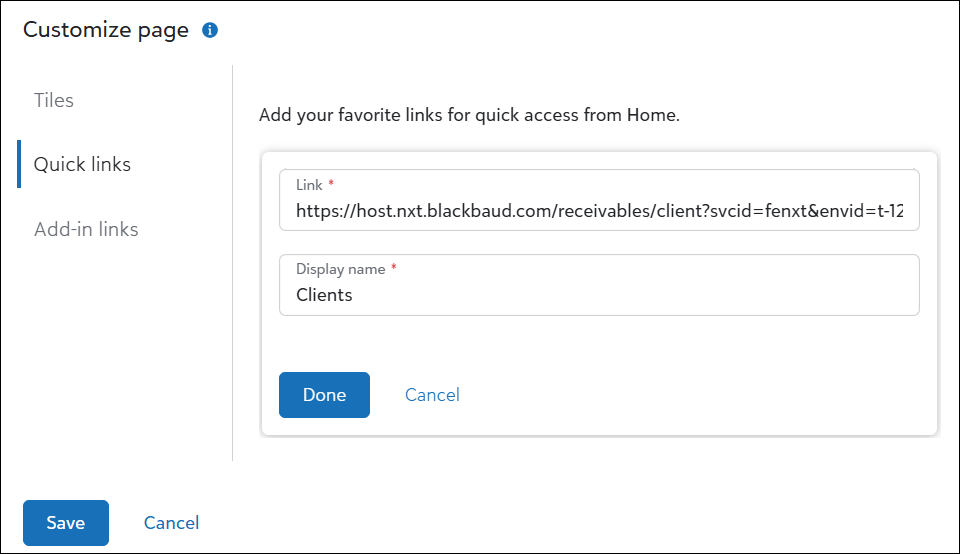 Add-in links provide independent functionality that runs outside of Financial Edge NXT but appears seamlessly within your Blackbaud solution. These links are powered by SKY Add-ins, which can be developed by Blackbaud, Blackbaud partners, or third-party developers — including those at your own organization. A SKY Add-in link can be added to Home as a shortcut, providing quick access to external tools that feel native to the Blackbaud experience. You can build your own SKY Add-ins using our SKY Developer tools, including low-code options. For more details, review our Microsoft Power Platform documentation.