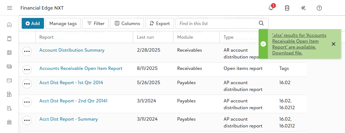 After you start the process, you can work in and out of Financial Edge NXT — there is no need to remain on the page until it completes. You can even close your browser with no risk of losing access or running incomplete reports.