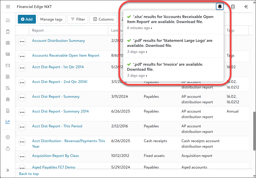Retrieve reports from the top-level navigation bell when they're complete.