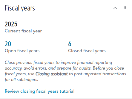Use Fiscal years to quickly access a list of open fiscal years from Settings, General ledger and close them. Closing previous fiscal years improves financial reporting accuracy, avoids errors, and helps prepare for audits. For details, see Closing Fiscal Years Tutorial.