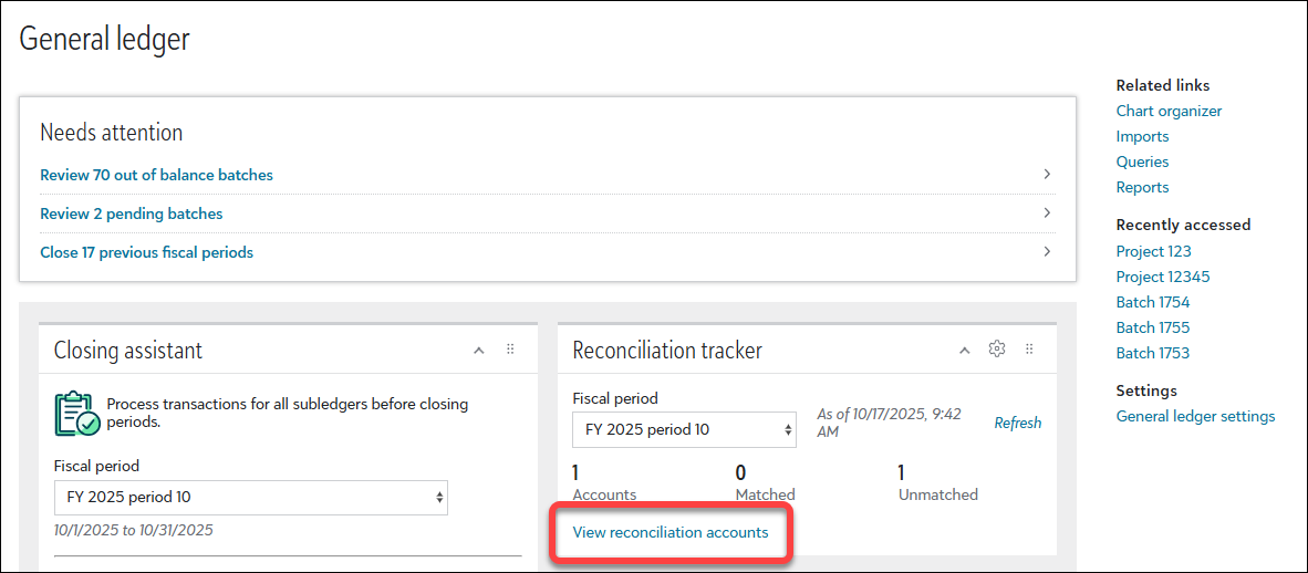 Use the Reconciliation tracker tile to keep an eye on accounts you reconcile frequently. This helps you stay organized and quickly identify out-of-balance accounts.