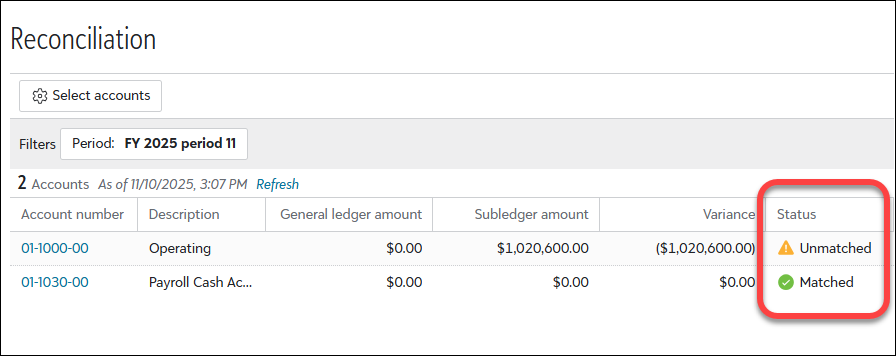 Under Status, quickly identify out-of-balance accounts that need attention.