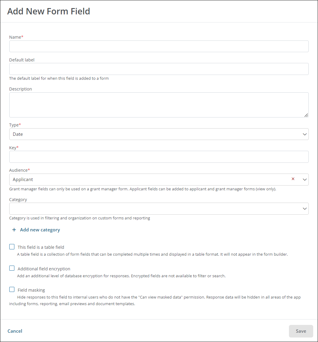 Optional - Choose a category to be used when filtering and organizing the field on custom forms and reports.