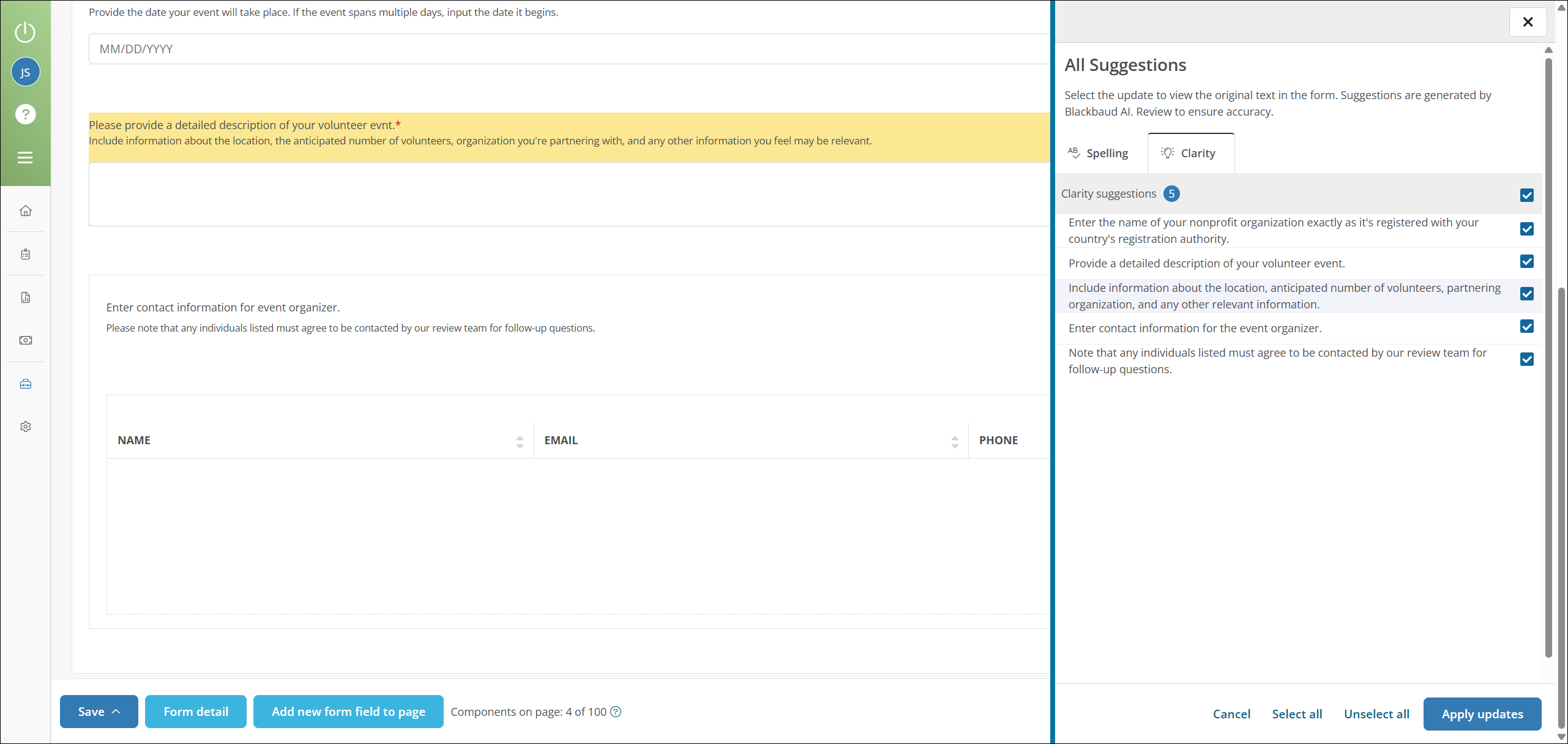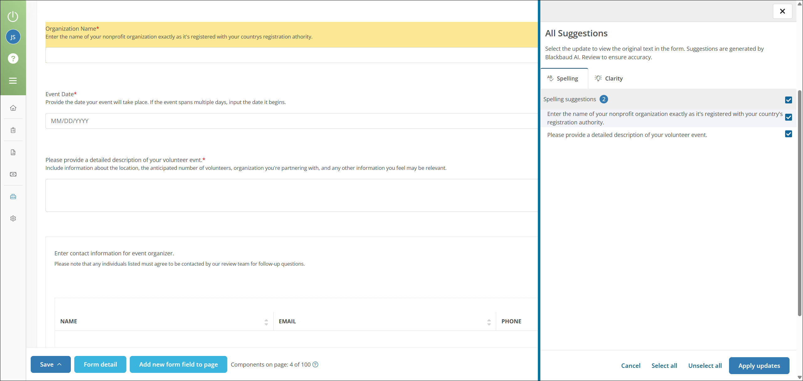 Use Form Intelligence in YourCause GrantsConnect to improve application forms with artificial intelligence (AI). The Make suggestions tool in the Form Builder identifies spelling, punctuation, and grammar issues, and recommends updates for clarity.