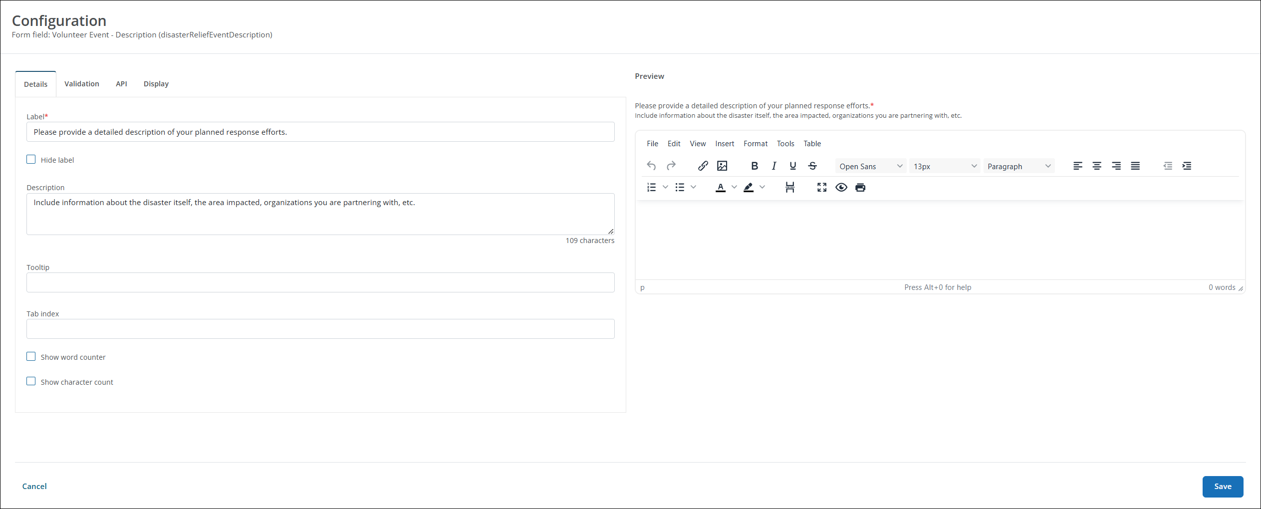 Show Requirements - Select the Show character count and Show word counter checkboxes to display the accepted counts in the field.