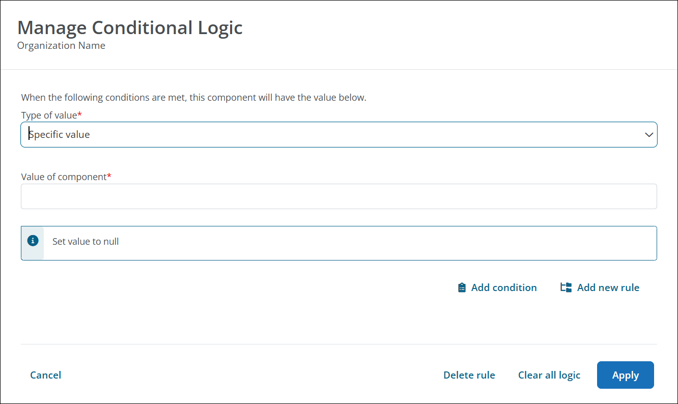 Set Value - In the Manage Conditional Logic modal, select the Type of value and then define the value based on your selection.