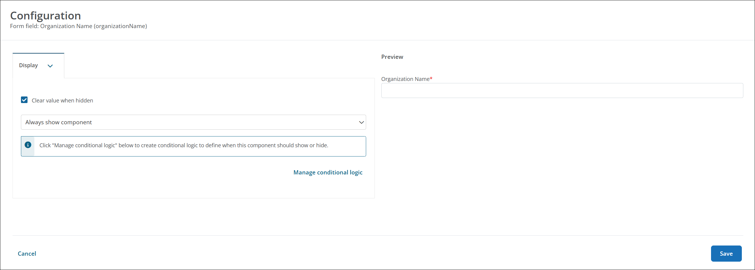 Tip: Conditional logic is required when Show component when or Hide component when is selected.