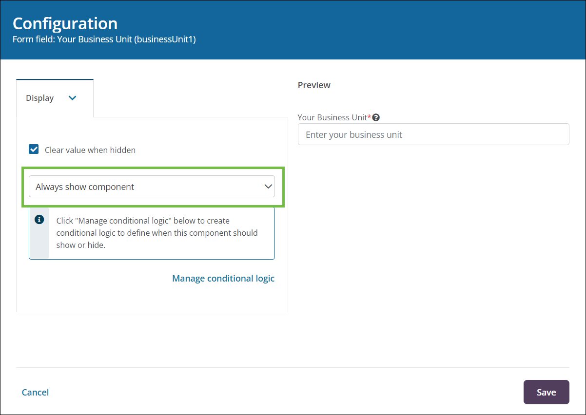 In the Manage Conditional Logic screen that appears, define the circumstances under which the component will or will not be displayed.