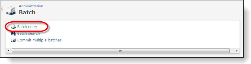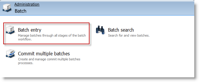 Navigate to the Administration functional area and click the Batch task, then click the Batch entry task that opens the Batch Entry page.