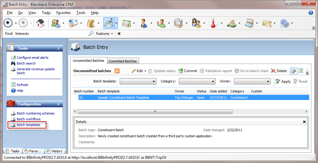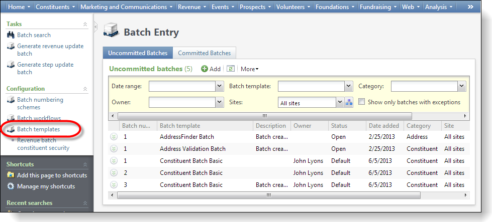 In the Configuration action group on the left, click the Batch templates action to open the Batch Templates page.