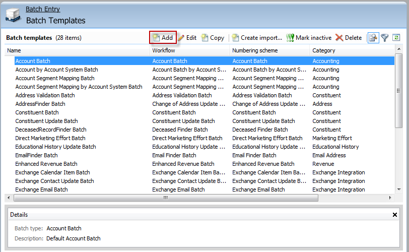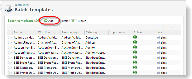 From the Batch Templates page, configure a new batch template by clicking the Add action above the Batch templates data list.