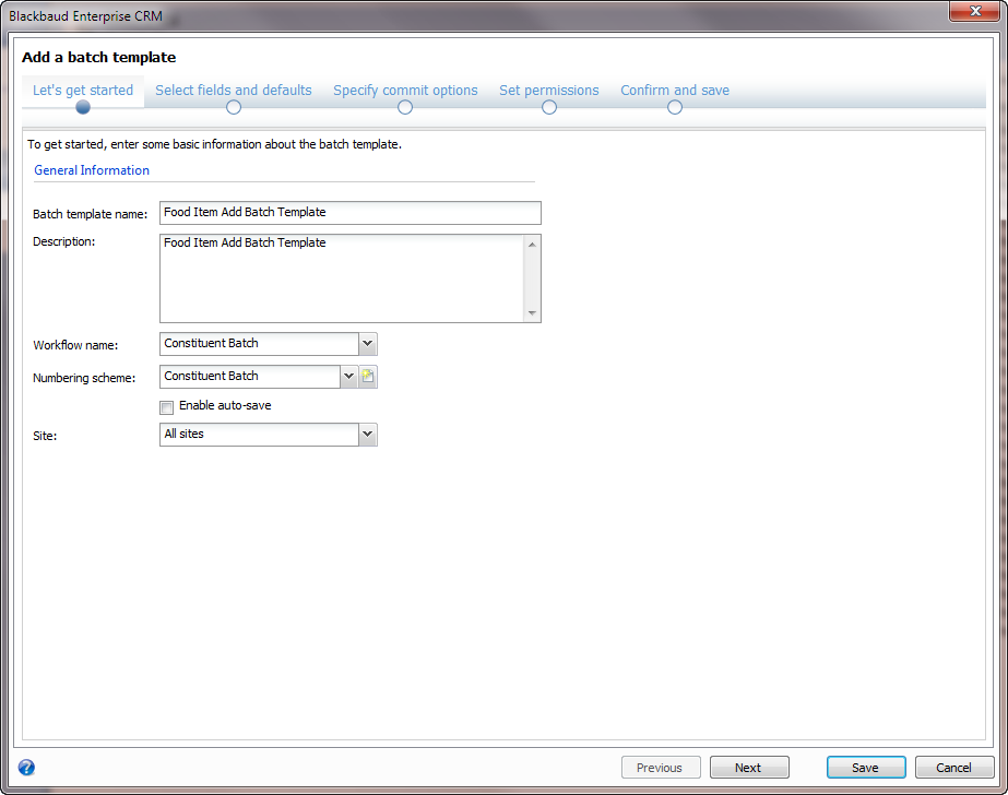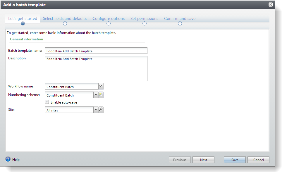 Use the Add action to add a new template To create batch templates, enter a name and description, select a batch workflow, and select batch numbering scheme. We provide this information on the Let's get started tab below.