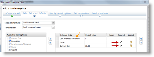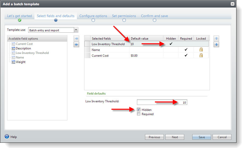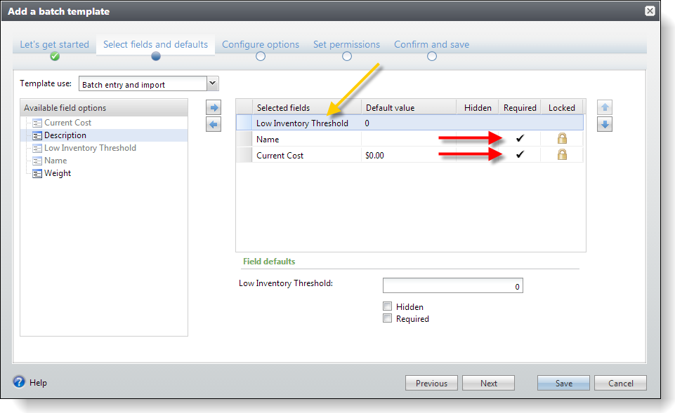 With the inclusion of the DefaultSelectedFields element in the BatchTypeSpec, you see the Low Inventory Threshold field (orange arrow) is pre-selected for you.