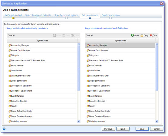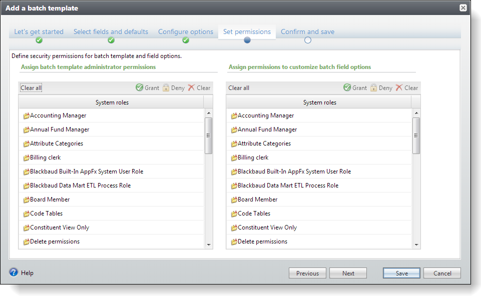 From the batch template, under Set permissions, you can assign permissions by system role. The permissions, "Grant" and "Deny," can be assigned to a system role for administration and to customize batch field options.