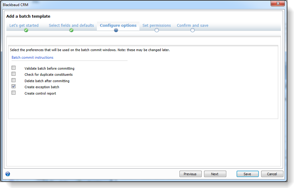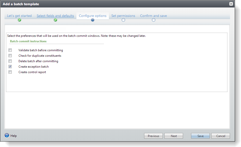 On the Configure options tab, we will accept the default option to create an exception batch. When the rows are committed and rows are transferred from batch staging tables to production tables, any rows within the batch that cause an exception will end up in a new exception batch. Rows that violate data integrity rules are marked with an exception message within the exception batch.