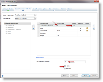 Additionally, mark the Low Inventory Threshold field hidden with a default value of "10." Marking a field as hidden still saves the default value to the staging table, but the field is not visible in the user interface grid when it comes time to add records to the batch.