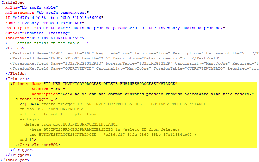 The TableSpec that creates the business process parameter table contains a delete trigger to delete related rows within the BusinessProcessInstanceTable.