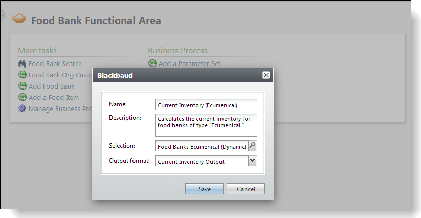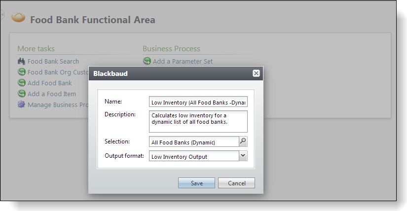Also notice the QUERYVIEWID form field that utilizes a simple data list with two parameters. It gives a list of business process views (output formats) that have a record type of "Food Bank" and a meta tag of "Inventory".
