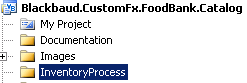 Within your Visual Studio Blackbaud.CustomFx.FoodBank.Catalog project, ensure there is a folder named InventoryProcess. We will put our Business Process Specs in this folder. If the folder does not exist, add the folder by right-clicking the Visual Basic project and select Add\new folder from the popup menu.