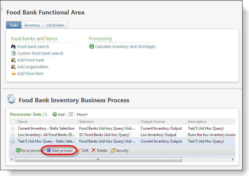 For an example of how a selection is used as a parameter within a parameter set for a business process, let's take a look at a data form that is used to manage a parameter set. Within the Food Bank's Inventory Process Business Process Add and Edit Forms, you can choose the selection to use as an input parameter into the business process. After it is saved, the data from these data forms is saved to a row USR_INVENTORYPROCESS table.
