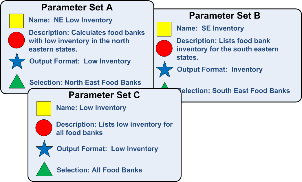 Individual parameters are organized into a parameter set. The end user can define multiple parameter sets for a given business process and then select a specific parameter set prior to launching the business process. A business process can be designed to accept zero, one, or several parameters. Before a business process is run, the end user selects a parameter set and starts the business process instance. With the parameter set for guidance, the business process instance processes the data. The parameters are used within the processing logic to produce the desired output. A business process can have a history of business process instances. Each instance is associated with a specific parameter set.