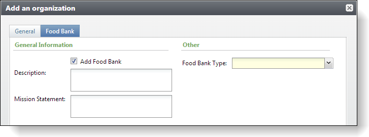 To add the organization as a food bank, the user can select an Add Food Bank checkbox. This should enable the food bank fields and make the Food Bank Type field required.
