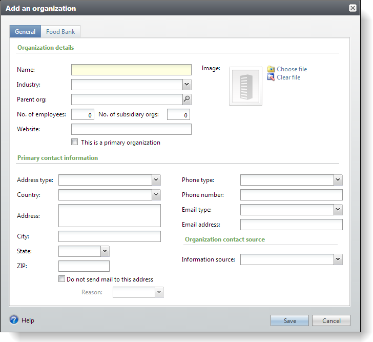 Currently, adding food bank is a two-step process. A user will have to create an organization (constituent) record first and then use the functionality below to select the organization to signify that it is a food bank. Below is a screen shot of the Food Bank Add Form in action.