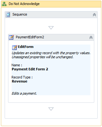 We will add a BusinessActivity named "Do Not Acknowledge" to the flowchart. We will add a Sequence activity within the BusinessActivity and then leverage the PaymentEditForm2 edit data form within the Sequence activity.