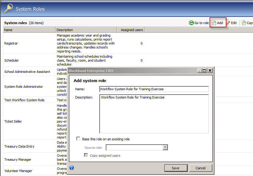 Click the Add action and name your new system role "Workflow System Role for Training Exercise."