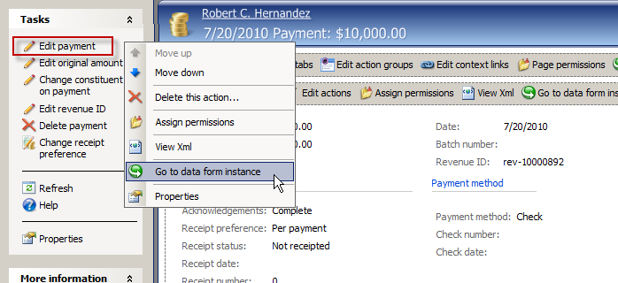 Right-click the Edit payment action on the left side of the Revenue Transaction page. Click the Go to data form instance action in the popup menu.