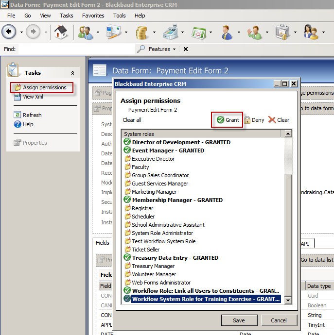 In the figure above, you probably noticed the activity named PaymentEditForm2. You may have asked yourself "How did that activity get into the toolbox?" Using Infinity features such as data forms, record operations, and data lists to automate functionality inside of a workflow is pretty easy to set up. The pattern is to set up a System Role within the Infinity application that is configured with the features to use within our workflow. So in the case of the PaymentEditForm2, we grant permissions to the edit data form within a System Role that is dedicated to the workflow.