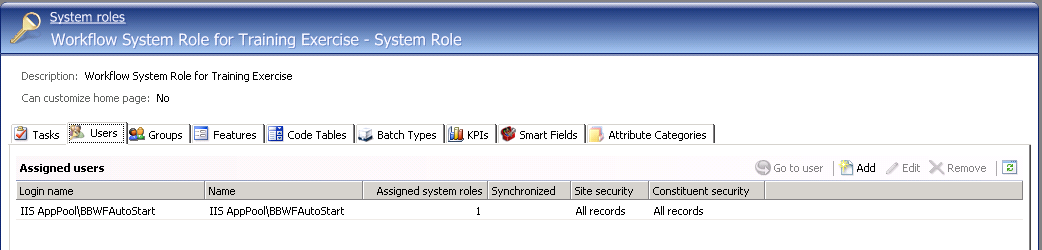 Since the IIS AppPool\BBWFAutoStart application user account needs permission to automate Infinity features, it is placed into a system role that is used to organize the workflow features. In the example below, the system role is named Workflow System Role for Training Exercise.