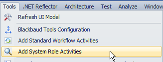 Note: Add System Role Activities is a helpful tool that comes with the Blackbaud Workflow Visual Studio 2010 Extension that is installed with Blackbaud.AppFx.Workflow.VSPackage.vsix, which is a Visual Studio 2010 extension deployment file. The Blackbaud.AppFx.Worfklow.VSPackage extension makes it easy to work with the specific activities you need to use for a given workflow because it allows you to quickly place activities from many different catalogs into a single tab on your Visual Studio 2010 workflow toolbox. Add System Role Activities helps us add some of the pre-built Blackbaud Workflow 4 activities that ship with the SDK as part of every out of the box feature catalog. In fact, more than 8000 activities are in the Blackbaud activity library. You can see these activity assemblies within your SDK\DLLReferences folder. The assemblies end with the name ".Activities.dll." To learn more about how to configure your Visual Studio 2010 development environment, see Preparing Your Visual Studio 2010 Development Environment for Infinity Workflow.