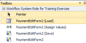 Tip: When you added the Payment Edit Form 2 Infinity feature to the system role and then added the feature into the Visual Studio 2010 development environment as a workflow activity, why did four activities appear within the Toolbox instead of a single workflow activity? In the figure below, we see four activities for a given edit data form. The PaymentEditForm2 activity allows us to retrieve the values to edit, provide a way to update the values, and then commit or save the values to the database, all in a single activity. The other three activities (Load, Assign Values, and Save) allow you to do the same thing, but you have the option to perform other operations/activities in between each activity. The PaymentEditForm2 (Load) activity only loads the data into a variable. After the data is retrieved, you are free to perform other activities within the workflow. You may then update the values at a later time with the PaymentEditForm2 (Assign Values) activity. You may then perform other activities and assign more values. Finally, you can save the values back to the database with the PaymentEditForm2 (Save) activity.