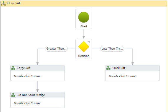 Navigate back to the Flowchart Activity and wire up the Blackbaud BusinessActivity below the Large Gift BusinessActivity.
