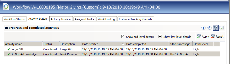 Search for the latest workflow instance and open the workflow instance page. On the Activity Status tab, notice the new Business Activity "Do Not Acknowledge."