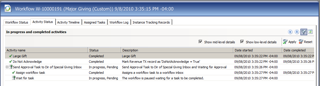 A BusinessActivity surfaces information about its status in the application on the Workflow Instance page. Here is a view of the Workflow Instance page for an instance of the completed major giving workflow that is in progress:
