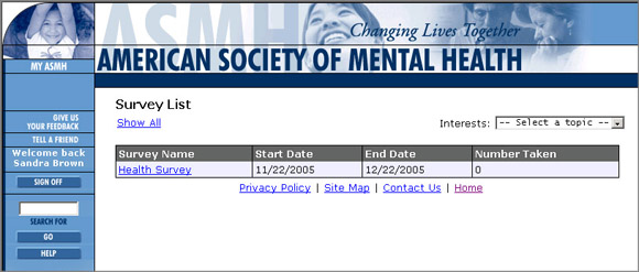 This viewer is currently viewing the list of surveys that are associated with her "favorite" interests. (The link to "Show All" surveys is replaced by "Show Favorites" when selected by the user.) The interest selector box at the right of the page allows the user to search for a survey that relates to a specific interest.