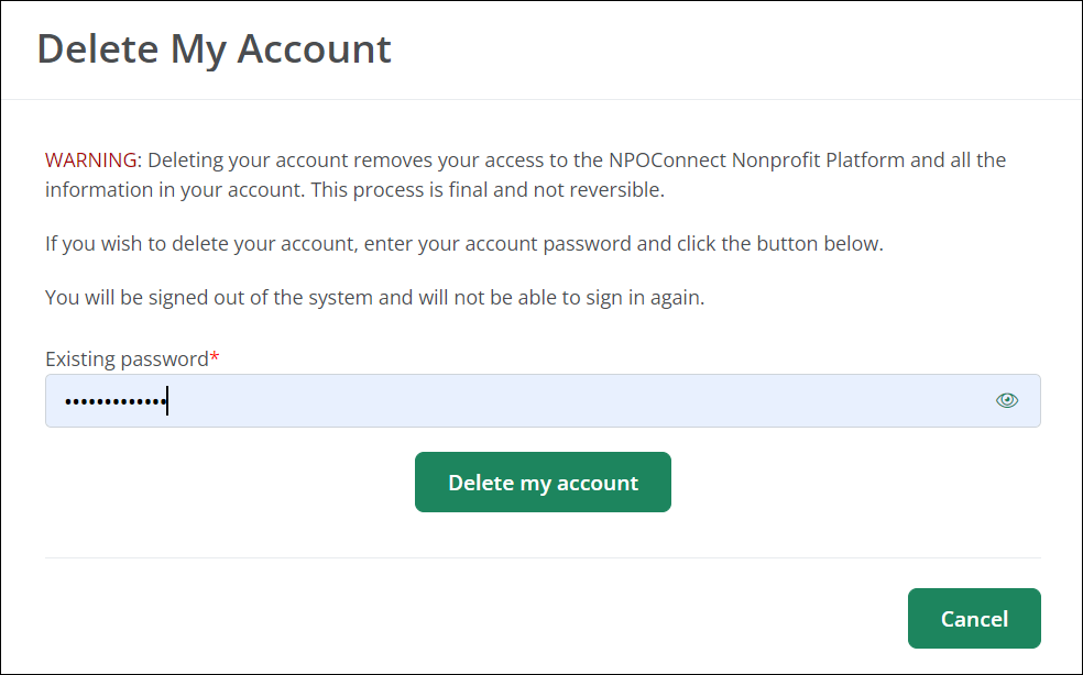 To finalize deletion, click on the Delete my account button. Otherwise, click Cancel.