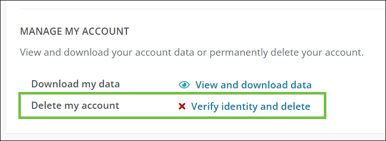 In the Manage My Account section, click on the Verify identity and delete link next to Delete my account.